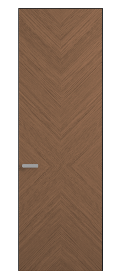 Полотно Рифт в скрытом алюминиевом коробе становится полноценным элементом декора. В коллекции представлено 9 моделей дверей в высоте до 3 метров. Рисунок раскладки шпона варьируется от простого до сложного. «Рубашка» для каждого полотна подбирается вручную по цвету, текстуре и фактуре.