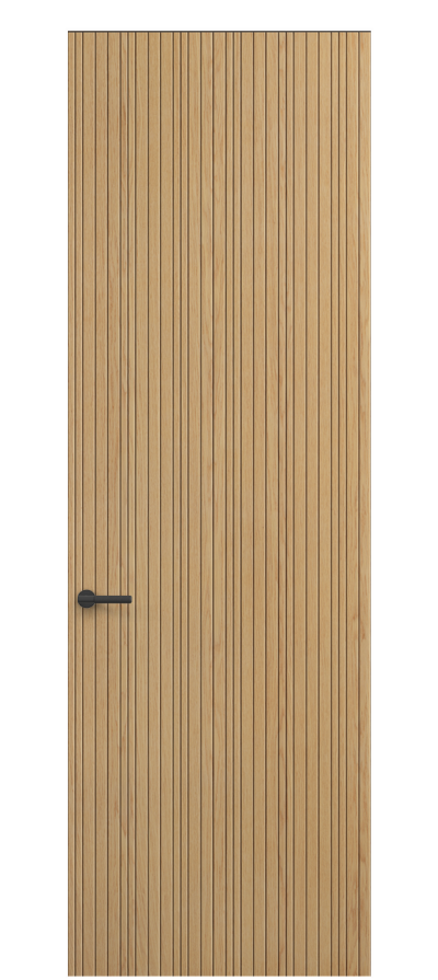 Селект — коллекция минималистичных дверей с фрезеровкой по натуральному шпону. Рельеф на поверхности полотна создаёт игру света и тени, добавляя пространству динамичности и визуального объёма. Двери Селект в сочетании со стеновыми панелями и мебельными фасадами, повторяющими лаконичный дизайн, создают единое стилевое решение.